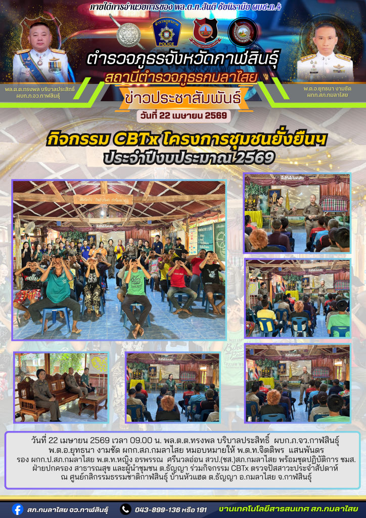 กิจกรรม CBTx ชุมชนยั่งยืนฯ 22 เมษายน 2569 โดย kasai policeman / การปฏิบัติหน้าที่ของตำรวจ,การปฏิบัติหน้าที่ของตำรวจ,งานป้องกันปราบปราม,งานชุมชนสัมพันธ์,การปฏิบัติหน้าที่ของตำรวจ,งานป้องกันปราบปราม,การปฏิบัติหน้าที่ของตำรวจ,งานป้องกันปราบปราม,ปป. -เมษายน 2569 วันที่ 22 เมษายน 2569 เวลา 09.00 น. พล.ต.ต.ทรงพล บริบาลประสิทธิ์ ผบก.ภ.จว.กาฬสินธุ์ พ.ต.อ.ยุทธนา งามชัด ผกก.สภ.กมลาไสย หมอบหมายให้ พ.ต.ท.จิตติพร แสนพันดร รอง ผกก.ป.สภ.กมลาไสย พ.ต.ท.หญิง อรพรรณ ศรีนวลอ่อน สวป.(ชส.)สภ.กมลาไสย พร้อมชุดปฏิบัติการ ชมส. ฝ่ายปกครอง สาธารณสุข และผู้นำชุมชน ต.ธัญญา ร่วมกิจกรรม CBTx ตรวจปัสสาวะประจำสัปดาห์ ณ ศูนย์กสิกรรมธรรมชาติกาฬสินธุ์ บ้านหัวแฮด ต.ธัญญา อ.กมลาไสย จ.กาฬสินธุ์ FacebookFacebookXXLINELine