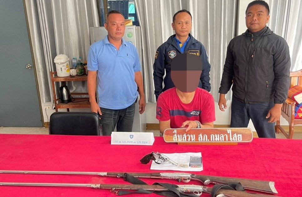 จับกุมยาบ้า อาวุธปืนพร้อมเครื่องกระสุน 20 มิถุนายน 2568 โดย admin / การปฏิบัติหน้าที่ของตำรวจ,การปฏิบัติหน้าที่ของตำรวจ,งานสืบสวน วันที่ 20 มิถุนายน 2568 พ.ต.ท.ถาวร ยอดยรรยง รอง ผกก.สส.ฯ พ.ต.ท.วีระชาติ คำเพราะ สว.สส.ฯ มอบหมายให้ ชุดสืบสวน ออกปฏิบัติหน้าสืบสวนยาเสพติดในพื้นที่ ผลการปฏิบัติ ได้จับกุมผุ้ต้องหา 1 ราย ข้อหา จำหน่าย(ยาบ้า)ฯ, มีอาวุธปืนและเครื่องกระสุนปืนไว้ในครอบครองฯ ของกลาง ยาบ้า จำนวน 18 เม็ด, อาวุธปืนพกสั้นรีวอลเวอร์ ขนาด .22 จำนวน 1 กระบอก, อาวุธปืนไทยประดิษฐ์(ปืนแก๊ปยาว) จำนวน 2 กระบอก, กระสุนปืนขนาด .22 จำนวน 9 นัด สถานที่จับกุม บ้านโนนเมือง หมู่ 7 ต.ดงลิง อ.กมลาไสย จ.กาฬสินธุ์ FacebookFacebookXXLINELine