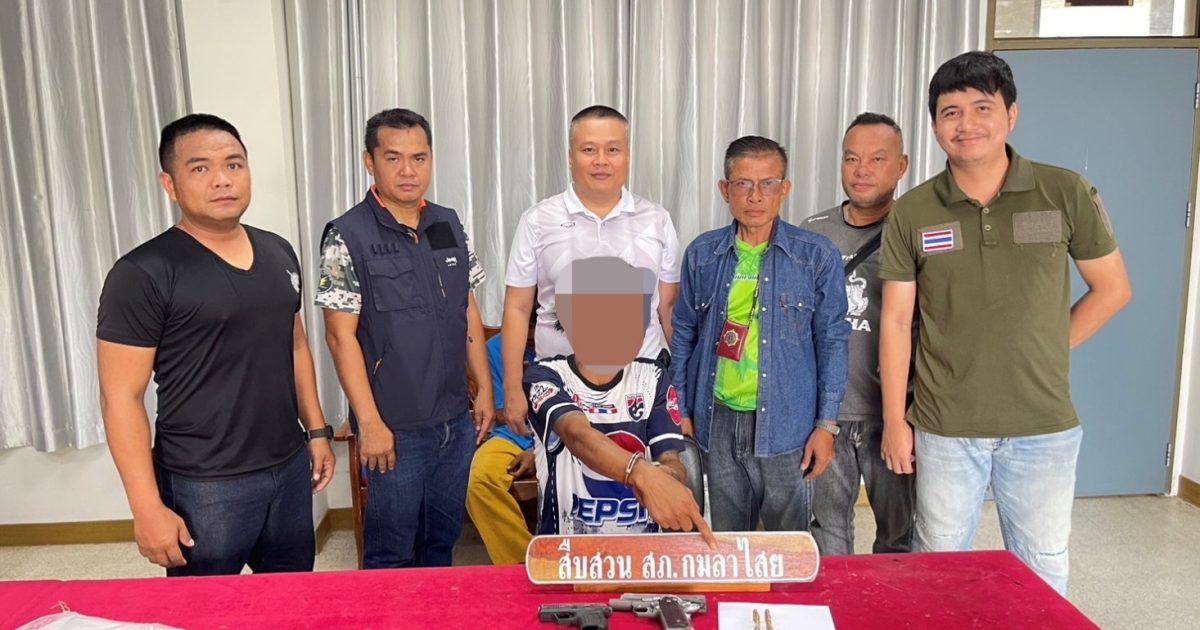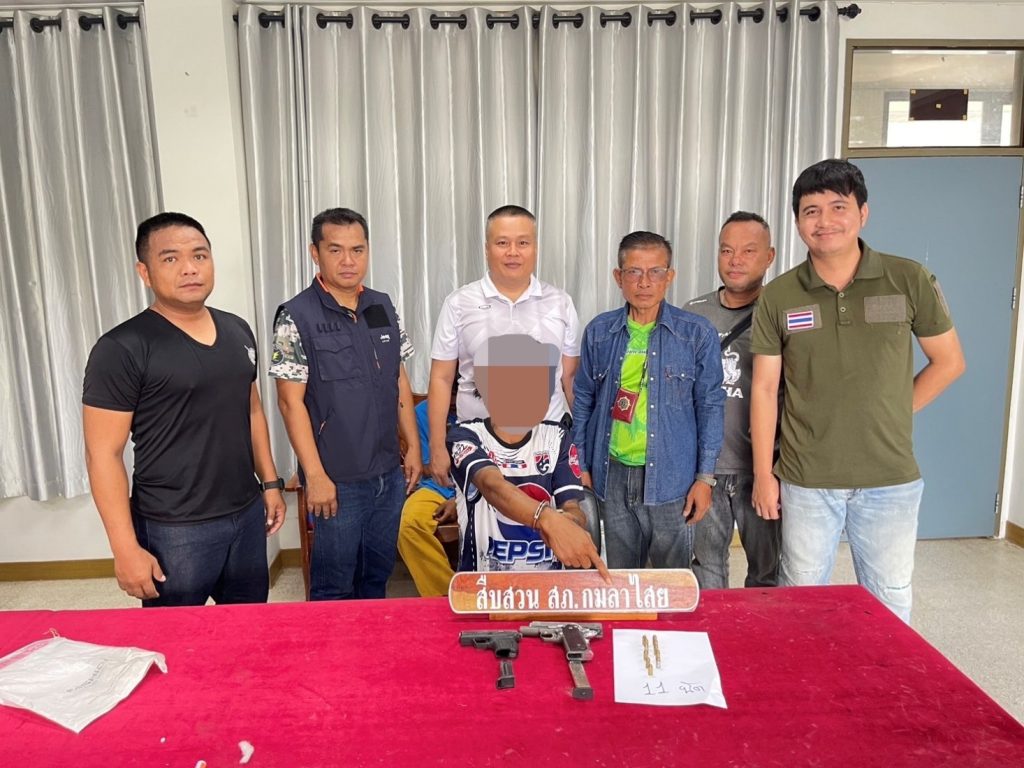 จับกุมอาวุธปืนและเครื่องกระสุนผิดกฎหมาย 7 พฤษภาคม 2568 โดย admin / การปฏิบัติหน้าที่ของตำรวจ,การปฏิบัติหน้าที่ของตำรวจ,งานสืบสวน วันที่ 7 พฤษภาคม 2568 พ.ต.อ.ธีรวุฒิ วงศาอ้วน ผกก.สภ.กมลาไสย มอบหมายให้ ชุดสืบสวน สภ.กมลาไสย นำโดย พ.ต.ท.ถาวร ยอดยรรยง รอง ผกก.สส.ฯ พ.ต.ท.วีระชาติ คำเพราะ สว.สส.ฯ พร้อมชุดสืบสวน ได้ร่วมกันจับกุมผู้ต้องหาใน ข้อหา มีอาวุธปืนและเครื่องกระสุนปืนไว้ในครอบครองฯ ของกลาง อาวุธปืนสั้นไทยประดิษฐ์ ขนาด .380 จำนวน 2 กระบอก, กระสุนปืนขนาด .380 จำนวน 11 นัด สถานที่จับกุม บ้านฟากปาว หมู่ 14 ต.กมลาไสย อ.กมลาไสย จ.กาฬสินธุ์ FacebookFacebookXXLINELine