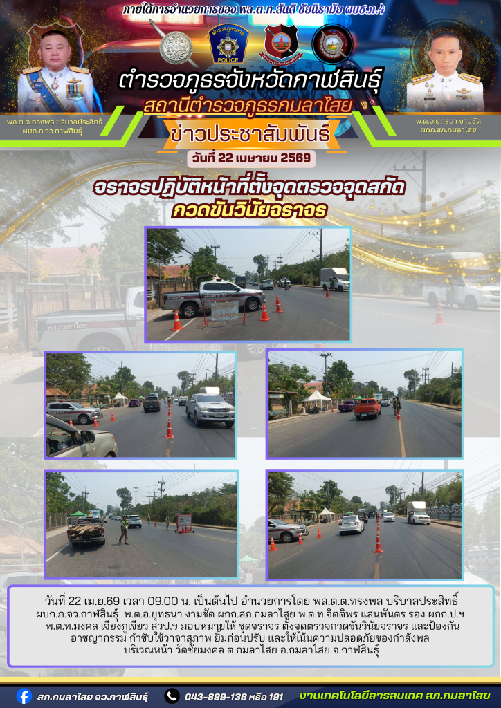 ตั้งจุดตรวจจุดสกัด กวดขันวินัยจราจร 22 เมษายน 2569 โดย kasai policeman / การปฏิบัติหน้าที่ของตำรวจ,การปฏิบัติหน้าที่ของตำรวจ,งานจราจร,ข้อมูลจราจร,การปฏิบัติหน้าที่ของตำรวจ,งานจราจร,การปฏิบัติหน้าที่ของตำรวจ,งานจราจร,จร.-เมษายน 2569 วันที่ 22 เม.ย.69 เวลา 09.00 น. เป็นต้นไป อำนวยการโดย พล.ต.ต.ทรงพล บริบาลประสิทธิ์ ผบก.ภ.จว.กาฬสินธุ์ พ.ต.อ.ยุทธนา งามชัด ผกก.สภ.กมลาไสย พ.ต.ท.จิตติพร แสนพันดร รอง ผกก.ป.ฯพ.ต.ท.มงคล เจียงภูเขียว สวป.ฯ มอบหมายให้ ชุดจราจร ตั้งจุดตรวจกวดขันวินัยจราจร และป้องกันอาชญากรรม กำชับใช้วาจาสุภาพ ยิ้มก่อนปรับ และให้เน้นความปลอดภัยของกำลังพล บริเวณหน้า วัดชัยมงคล ต.กมลาไสย อ.กมลาไสย จ.กาฬสินธุ์ FacebookFacebookXXLINELine