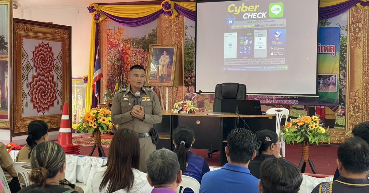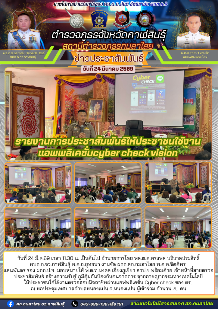 วันที่ 24 มี.ค.69 เวลา 11.30 น. เป็นต้นไป อำนวยการโดย พล.ต.ต.ทรงพล บริบาลประสิทธิ์ ผบก.ภ.จว.กาฬสินธุ์ พ.ต.อ.ยุทธนา งามชัด ผกก.สภ.กมลาไสย พ.ต.ท.จิตติพร แสนพันดร รอง ผกก.ป.ฯ มอบหมายให้ พ.ต.ท.มงคล เจียงภูเขียว สวป.ฯ พร้อมด้วย เจ้าหน้าที่สายตรวจ ประชาสัมพันธ์ สร้างความรับรู้ ภูมิคุ้มกันป้องกันตนจากการ จากอาชญากรรมทางเทคโนโลยี ให้ประชาชนได้ใช้งานตรวจสอบมิจฉาชีพผ่านแอฟพลิเคชั่น Cyber check ของ ตร. ณ หอประชุมเทศบาลตำบลหนองแปน ต.หนองแปน ผู้เข้าร่วม จำนวน 70 คน