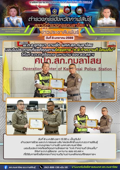 มอบใบประกาศ โครงการ “ทำดี มีคนเห็น ภ.4” 9 มกราคม 2569 โดย kasai policeman / ข่าวภารกิจผู้บังคับบัญชา,การปฏิบัติหน้าที่ของตำรวจ,งานจราจร FacebookFacebookXXLINELine