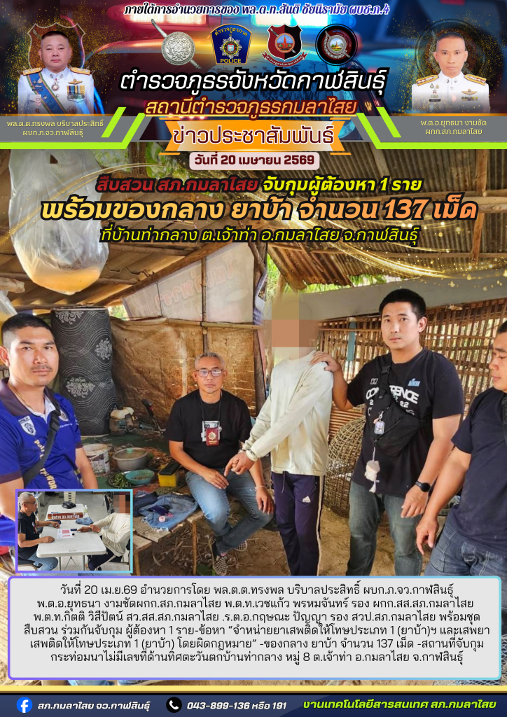 วันที่ 20 เม.ย.69 อำนวยการโดย พล.ต.ต.ทรงพล บริบาลประสิทธิ์ ผบก.ภ.จว.กาฬสินธุ์ พ.ต.อ.ยุทธนา งามชัดผกก.สภ.กมลาไสย พ.ต.ท.เวชแก้ว พรหมจันทร์ รอง ผกก.สส.สภ.กมลาไสย พ.ต.ท.กิตติ วิสีปัตน์ สว.สส.สภ.กมลาไสย .ร.ต.อ.กฤษณะ ปัญญา รอง สวป.สภ.กมลาไสย พร้อมชุดสืบสวน ร่วมกันจับกุม ผู้ต้องหา 1 ราย-ข้อหา “จำหน่ายยาเสพติดให้โทษประเภท 1 (ยาบ้า)ฯ และเสพยาเสพติดให้โทษประเภท 1 (ยาบ้า) โดยผิดกฎหมาย” -ของกลาง ยาบ้า จำนวน 137 เม็ด -สถานที่จับกุม กระท่อมนาไม่มีเลขที่ด้านทิศตะวันตกบ้านท่ากลาง หมู่ 8 ต.เจ้าท่า อ.กมลาไสย จ.กาฬสินธุ์