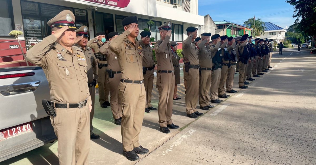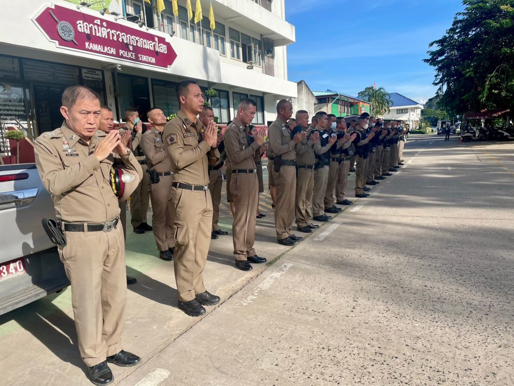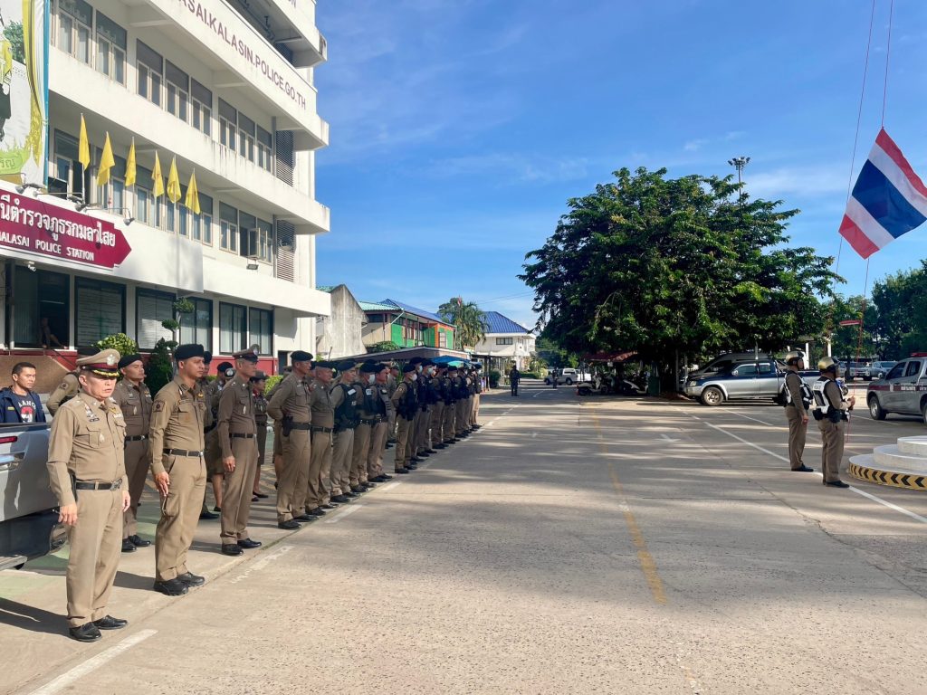 เคารพธงชาติประจำสัปดาห์ 16 พฤศจิกายน 2566 โดย admin / การปฏิบัติหน้าที่ของตำรวจ,ข่าวภารกิจผู้บังคับบัญชา,ประชาสัมพันธ์กิจกรรมของหน่วย วันที่ 14 พฤศจิกายน 2566 เวลา 08.00 น. พ.ต.อ.ธีรวุฒิ วงศาอ้วน ผกก.สภ.กมลาไสย พ.ต.ท.ประพนธ์ ภูจอมนิล รอง ผกก.(สอบสวน).สภ.กมลาไสย พ.ต.ท.มงคล เจียงภูเขียว สวป.สภ.กมลาไสย พ.ต.ท.ภูษิต โคตรแสงอ่อน สว.อก.สภ.กมลาไสย พ.ต.ต.อมร เดชศรี สว.สส.สภ.กมลาไสย และข้าราชการตำรวจ สภ.กมลาไสย ร่วมกันแสดงความเคารพธงชาติ ร้องเพลงสรรเสริญพระบารมี สวดมนต์ไหว้พระ กล่าวคำสัตย์ปฏิญาณ อุดมคติตำรวจ ตรวจการแต่งกาย ทรงผม อุปกรณ์เครื่องเเต่งกาย ชี้แจงข้อราชการต่างๆ แล้วปล่อยแถวสายตรวจออกปฏิบัติหน้าที่ต่อไป บริเวณหน่าที่ทำการสถานีตำรวจภูธรกมลาไสย FacebookFacebookXXLINELine
