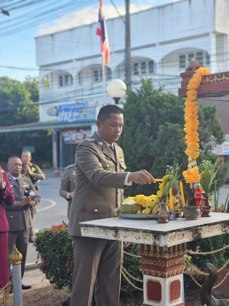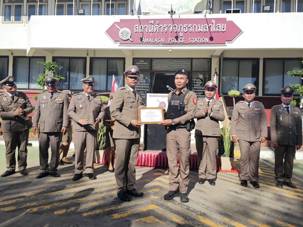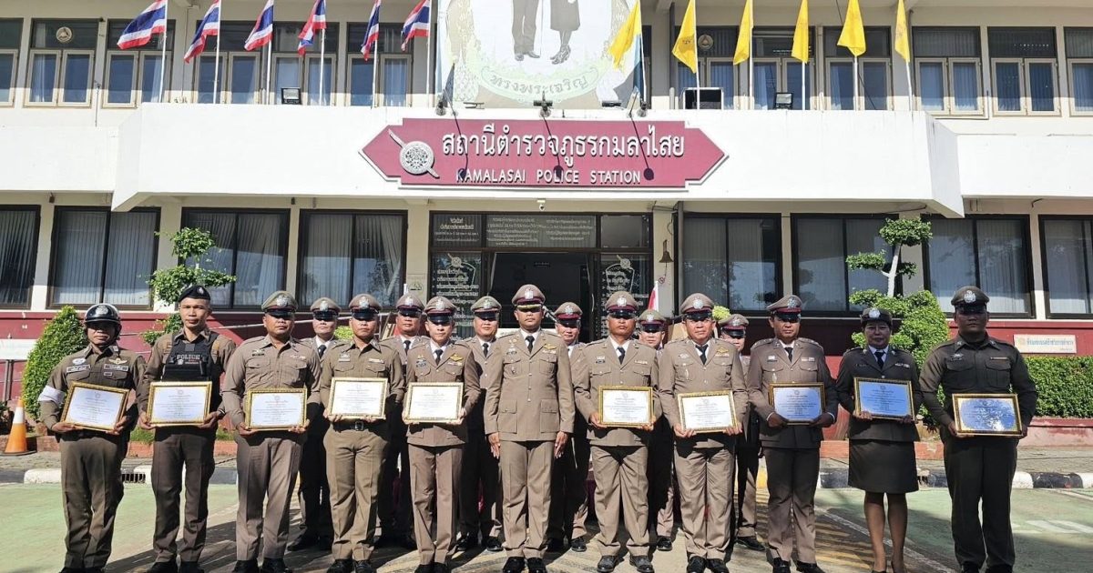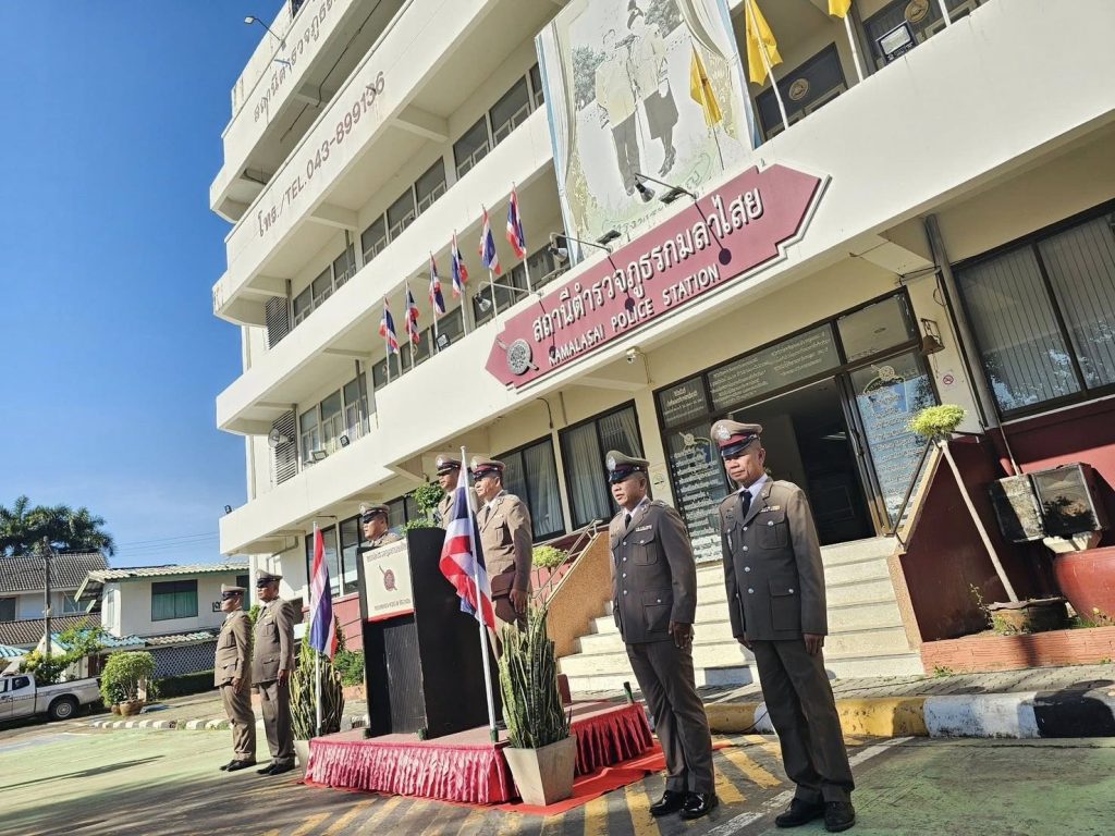 วันที่ 17 ตุลาคม 2568 เวลา 06.30 น. พ.ต.อ.ขจรฤทธิ์ วงษ์ราช รอง ผบก.ภ.จว.กาฬสินธุ์ รรท.ผกก.สภ.กมลาไสย พ.ต.ท.ประพนธ์ ภูจอมนิล รอง ผกก.(สอบสวน)ฯ พ.ต.ท.ถาวร ยอดยรรยง รอง ผกก.สส.ฯ พร้อมข้าราชการตำรวจ สภ.กมลาไสย ทุกนาย ร่วมพิธีไหว้ศาล ปู่ไฮ พิธีการทางศาสนา ทำบุญตักบาตร พิธีกล่าวคำสัตย์ปฏิญาณ อุดมคติตำรวจ บทปลงใจ อ่านสาร พล.ต.อ. กิตติ์รัฐ พันธุ์เพ็ชร์ ผบ.ตร. ถวายสัตย์ปฏิญาณตนเป็นข้าราชการตำรวจทีดี มอบเกียรติบัตรให้กับภาคประชาชนที่ให้การสนับสนุนช่วยเหลือกิจกรรมและภารกิจการปฏิบัติหน้าที่ มอบเกียรติบัตรให้กับข้าราชการตำรวจที่ได้รับคัดเลือกเป็นข้าราชการตำรวจดีเด่นภายในสถานี เนื่องในวันสถาปนาสำนักงานตำรวจแห่งชาติ(วันตำรวจ) 17 ตุลาคม 2568 โดยมี นางสาวแววตา นระทัด นายอำเภอกมลาไสย มาร่วมเป็นประธานในพิธี พร้อมด้วย นายยกเทศมนตรีกมลาไสย ประธาน กต.ตร. และ กรรมการ กต.ตร. พร้อมด้วยประชาชน เข้าร่วมในพิธีดังกล่าว ณ ลานหน้าที่ทำการสถานีตำรวจภูธรกมลาไสย