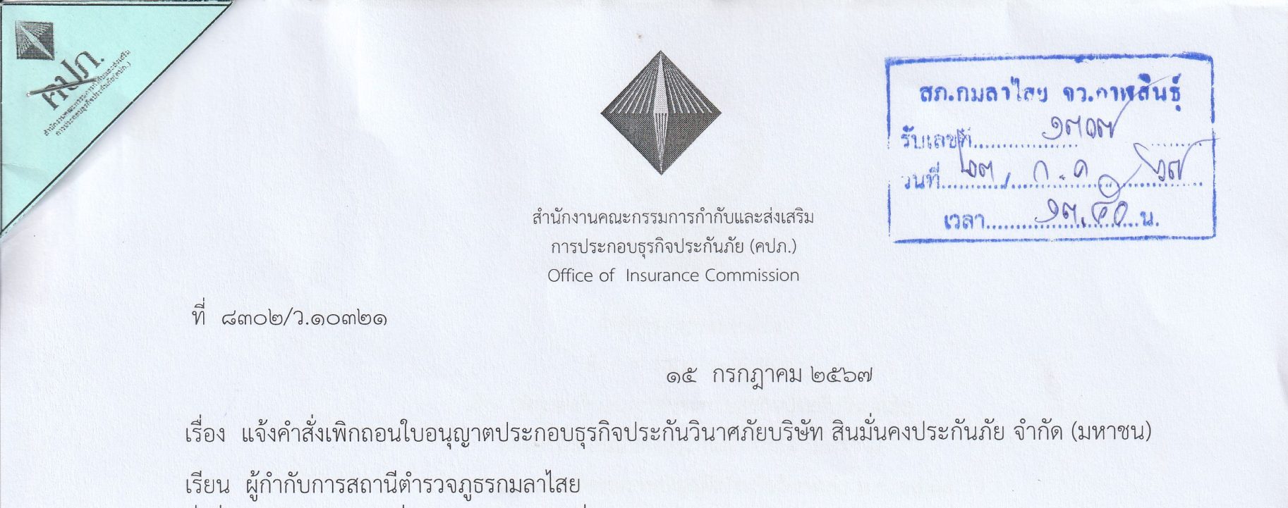 ด้วยได้รับหนังสือจาก สำนักงานคณะกรรมการกำกับและส่งเสริมการประกอบธุรกิจประกันภัย (คปภ.)ที่