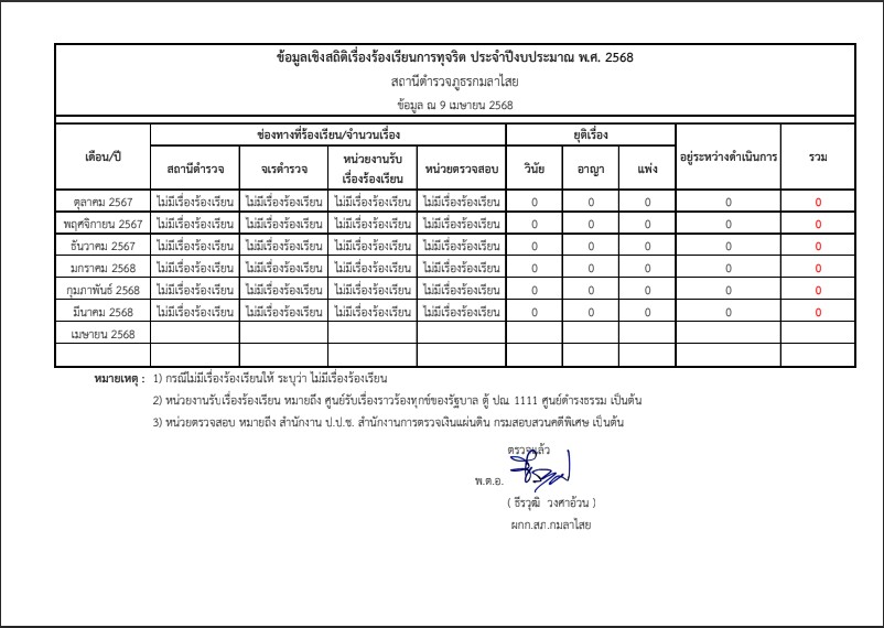 ข้อมูลสถิติการรับแจ้งเรื่องร้องเรียน ของปีงบประมาณ 2568 สถานีตำรวจภูธรกมลาไสย ในช่วง 6 เดือนแรก ตั้งแต่เดือน ตุลาคม 2567 ถึงเดือนมีนาคม 2568 ยังไม่มีการร้องเรียนการทุจริต รับสินบน แต่อย่างใด